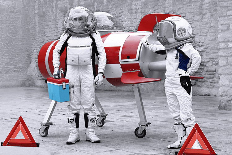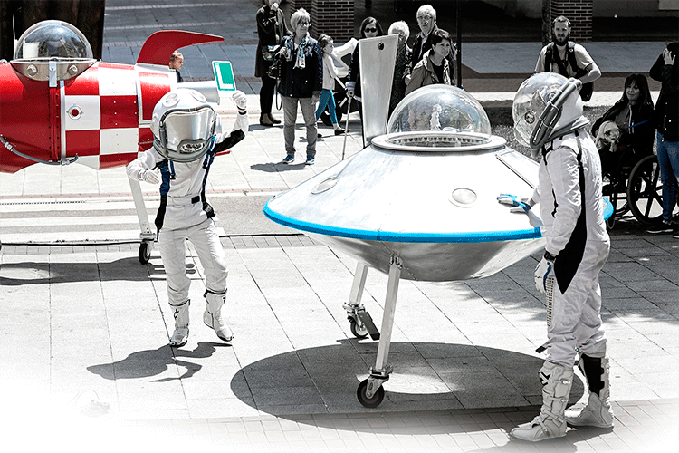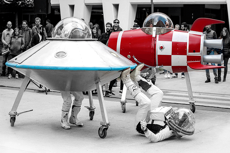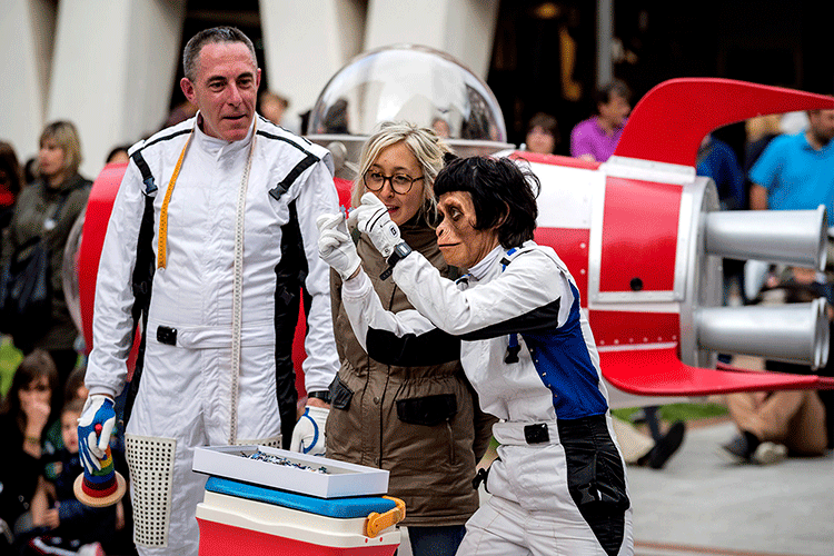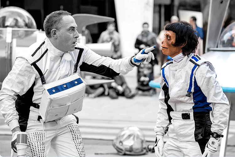 Bi espazio-ontzi kalean zehar ari dira, jendearen harridurarako. Ontzi batek bestearen kontra talka egiten du. Eztabaida betean kaskoak kentzen dituzte eta hara non horietako bat tximinoa den!Espazioko lasterketaren eta eboluzioaren ikuspegi iraultzailea eta umoretsua da. Kolokan jartzen ditu Darwin-en teoriak, zaila baita jakitea nor den noren eboluzioa.Espazioko komedia bat da emaitza, piknik galaktiko zoro bat. Bertan, espazioan eta denboran zehar bidaiatzen ari diren pertsonaia horien inozentziaren konplize bihurtuko gara.